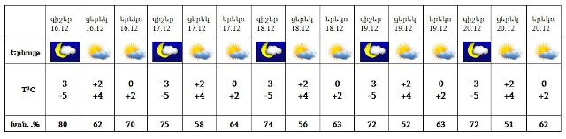 Դեկտեմբերի 16-20-ին սպասվում է առանց տեղումների եղանակ: Քամին՝ հյուսիս-արևմտյան‵ 2-7 մ/վրկ արագությամբ: