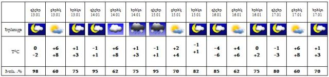 Հունվարի 13-ին, 14-ի գիշերը, 16-17-ին հանրապետությունում սպասվում է առանց տեղումների եղանակ, 14-ի երեկոյան ժամերին և 15-ի գիշերը շրջանների զգալի մասում, 15-ի ցերեկը Վայոց Ձորում և Սյունիքում սպասվում են տեղումներ, լեռնային շրջաններում` ձյուն, հովտային և նախալեռնային շրջաններում` ձնախառն անձրև: