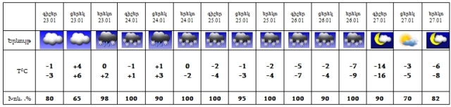 Հունվարի 23-ի գիշերը, 27-ին սպասվում է առանց տեղումների եղանակ, 23-ի օրվա երկրորդ կեսին, 24-ին սպասվում է թաց ձյուն, 25-26-ին՝ ձյուն: