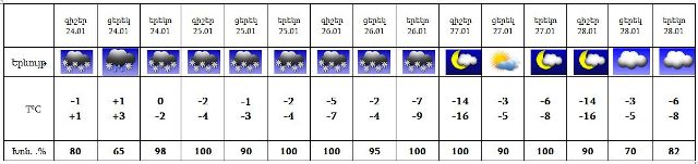 Հունվարի 24-ին սպասվում է թաց ձյուն, 25-26-ին‵ ձյուն: 27-28-ին սպասվում է առանց տեղումների եղանակ: