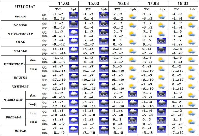 Ночью 14-го марта, 18-го ожидается погода без осадков, в вечерние часы 14-го, 15-го, ночью 16-го везде, а днем- в регионах Вайоц Дзор и Сюник, 17-го в регионах Лори, Тавуш, Сюник и в Арцахе время от времени ожидаются осадки, в горных районах - осадки в виде снега.