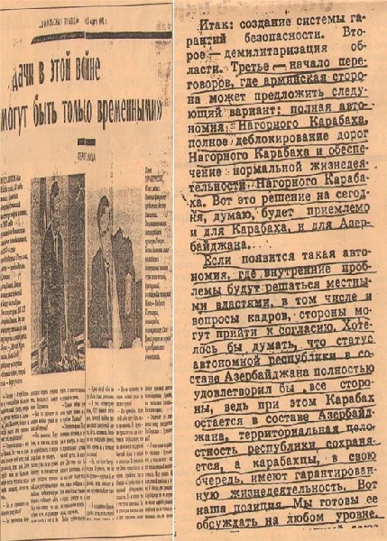 «Для меня важны только дипломатические документы и дипломатические позиции. Я мог бы ответить на ваш вопрос, для этого должен был бы раскрыть некоторые государственные тайны, чего не сделаю. Я не буду вдаваться в детали, но одно могу сказать точно. Все заявления сделанные Левоном Тер-Петросяном в тот период были направлены на информационное и политическое обеспечение военных действий. Более того, я не могу сказать, но хочу отметить то обстоятельство, что нашими заявлениями мы обеспечили победы. Сегодняшними высокопарными заявлениями, в частности цитированием «Комсомольской правды», сегодняшние власти пытаются обеспечить свое поражение, создать информационное обеспечение своего поражения».
