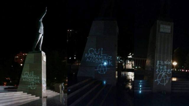 10 мая, в день рождения Гейдара Алиева, на постаменте одного из многочисленных памятников в его честь, в одноименном парке напротив здания Центрального банка Азербайджана в Баку, появилось граффити с надписью на азербайджанском языке «Поздравляем с праздником рабов!». Как передает «Panorama.am», об этом пишет сайт азербайджанского оппозиционного интернет-телевидения «Meydan.TV».