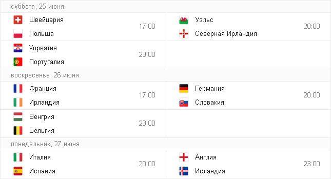 В 1/8 финала сыграют Швейцария-Польша, Хорватия-Португалия, Уэльс-Северная Ирландия, Венгрия-Бельгия, Германия-Словакия, Италия-Испания, Франция-Ирландия, Англия-Исландия.