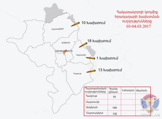 На восточном направлении линии соприкосновения азербайджанские ВС применили пушку Д-44 и миномет калибра 60 мм, выпустив 9 снарядов.
