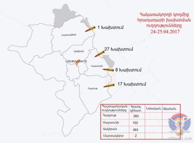 В результате нарушения противником режима прекращения огня в районе 17:50 24 апреля на оборонительном участке одной из воинских частей Армии обороны, дислоцированных на восточном направлении линии соприкосновения, смертельное огнестрельное ранение получил военнослужащий АО Нарек Амаякович Арутюнян (1997 г.р.).