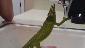 В сети большую популярность набирает видео, в котором хамелеон по имени Спайк впервые в жизни увидел струю воды, которая текла из крана.
