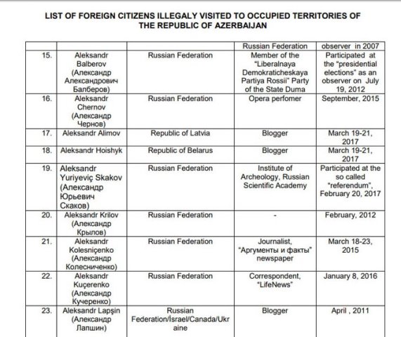 «Прошедшей зимой мы гуляли по латвийскому городу Даугавпилсу с Сашей Алимовым, путешественником, создателем сайта Travelblog.lv и просто отличным человеком. Недавно он побывал в Нагорном Карабахе и немедленно был внесен бдительными бакинскими ГБистами в черные списки за номером 17. Кстати, интересное наблюдение - они вносят только русскоязычных блогеров и журналистов, в списке нет ни одного журналиста, пищущего по-английски, или на каком-то еще языке. Думаю, это обьяснятся слабым знанием в соответствующих структурах Азербайджана иностранных языков. Не, ну вы представьте - осилить какой-нибудь текст журналиста на сайте CNN - это же профессором надо быть. Обратите внимание, как азербайджанские «граматеи» пишут «...visited TO occupied territories», в то время, как грамотно было бы написать без «to».