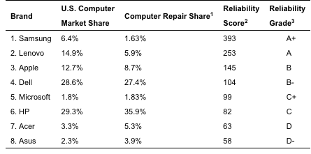 Специалисты компании «Rescuecom» составили рейтинг производителей ноутбуков по их надежности. В основу рейтинга положены два показателя: доля компании на рынке и процент обращений в сервис для ремонта.