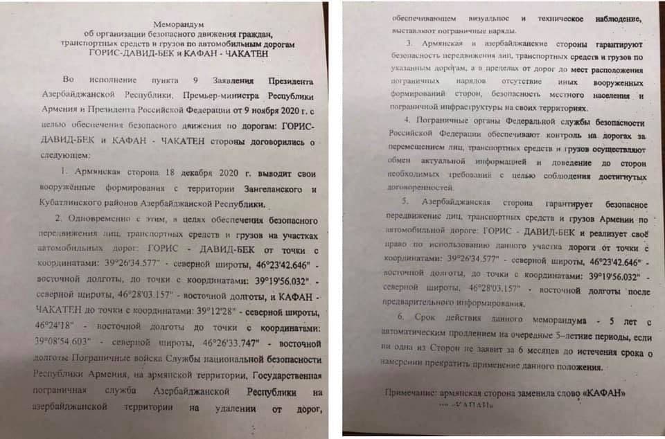 Единственное возражение армянской стороны – указание Капана вместо «Кафана». Учитывая, что меморандум вступал в действие 18 декабря, можно предположить, что захват Азербайджаном территорий и пленных в районе Хцаберда 5 днями ранее связан именно с зачисткой тыла (см. карты).
