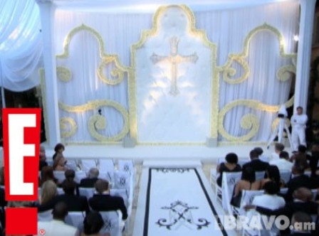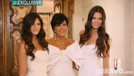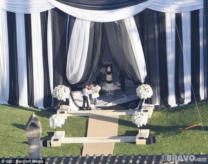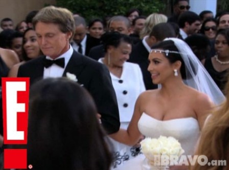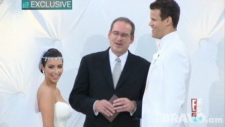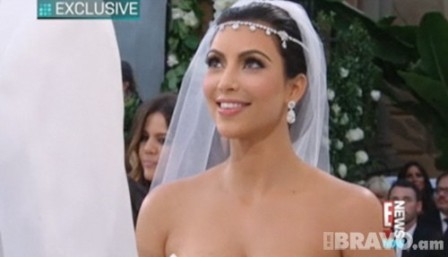 Невеста спустилась к гостям платье цвета слоновой кости от очень известного дизайнера, на свадьбу пригласили четыреста сорок гостей. Немного позднее Ким сменила еще два наряда, и все они были от одного производителя – Веры Вонг. Ее сестры – подружки невесты – были разодеты в роскошные платья от именных дизайнеров. После того как молодые дали свои клятвы, состоялся ужин, на котором можно было попробовать изысканные блюда и дорогие напитки.