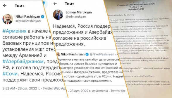 Утром Никол Пашинян написал в своем «Twitter», что в еще в сентябре принял российские предложения по нормализации и надеется, что Россия поддержит свои предложения. Почти то же самое говорит работающий у Никола послом по особым поручениям Эдмон Марукян, тот выразил надежду, что Азербайджан согласится на предложения РФ. Об этом написал на своей странице в «Facebook» главред «Yerevan.Today» Севак Акопян.