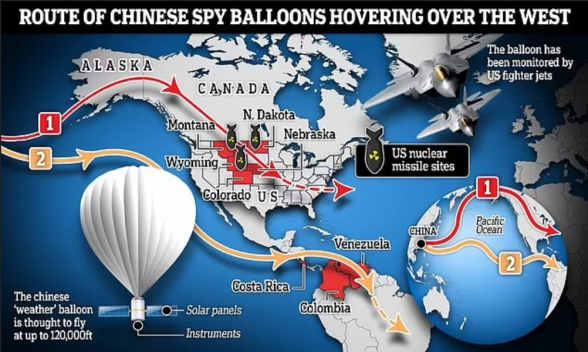 Китайский аэростат заметили в начале февраля над штатом Монтана, где находится база ВВС США Малмсторм и шахты ядерных ракет. Пролетевший позже над Северной Каролиной аппарат американские истребители сбили 4 февраля над Атлантическим океаном, в паре десятков километров от побережья.
