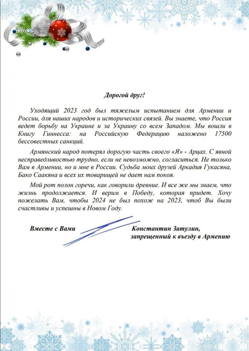 Пресс-служба депутата Государственной Думы Российской Федерации Константина Затулина приводит его обращение к друзьям в Армении в канун Нового года, которое публикуем ниже: