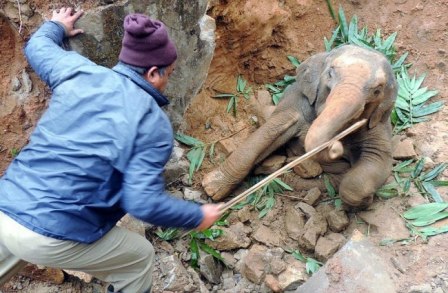 Пассажиры поезда увидели, что слоненок провалился в яму и уговорили машиниста остановиться и помочь ему. Пока ждали помощь, люди подкармливали его листьями, а приехавшие спасатели вытащили животное.
