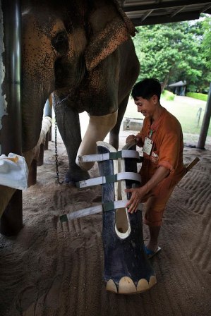 Слону, наступившему на фугас и потерявшему часть ноги, надевают новый протез.